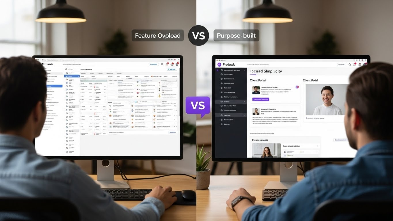 Right-sized for client work. Protawk focuses on freelancers, agencies, and small teams managing client projects. It includes essential features (3 views, client portal, milestones) without enterprise bloat.